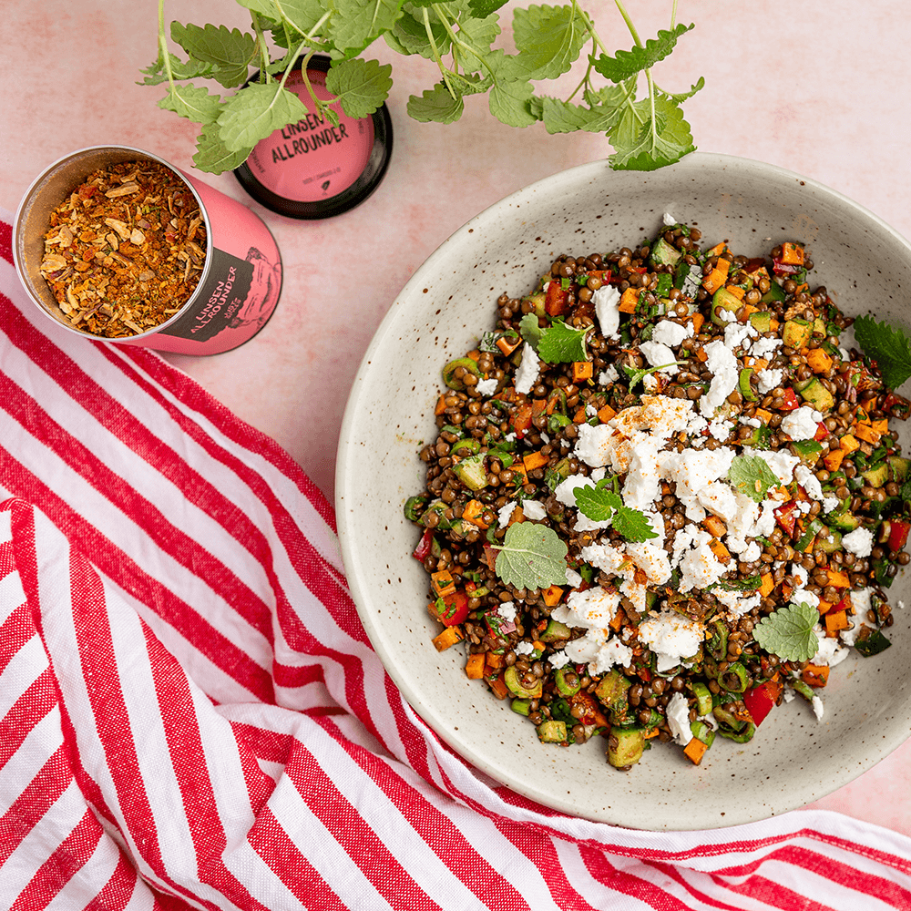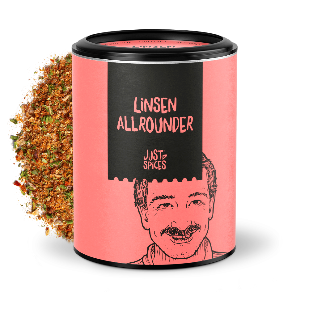 Rosa Kristallsalz, Tomatenraspel, rote Zwiebel geschnitten, Paprika gemahlen, Knoblauchraspel, Paprikaraspel, Toastzwiebel gemahlen, Lauch geschnitten, Schnittlauchröllchen, Ingwer geschnitten, Chili geschrotet, Koriander gemahlen, Kreuzkümmel gemahlen, Zimt gemahlen.